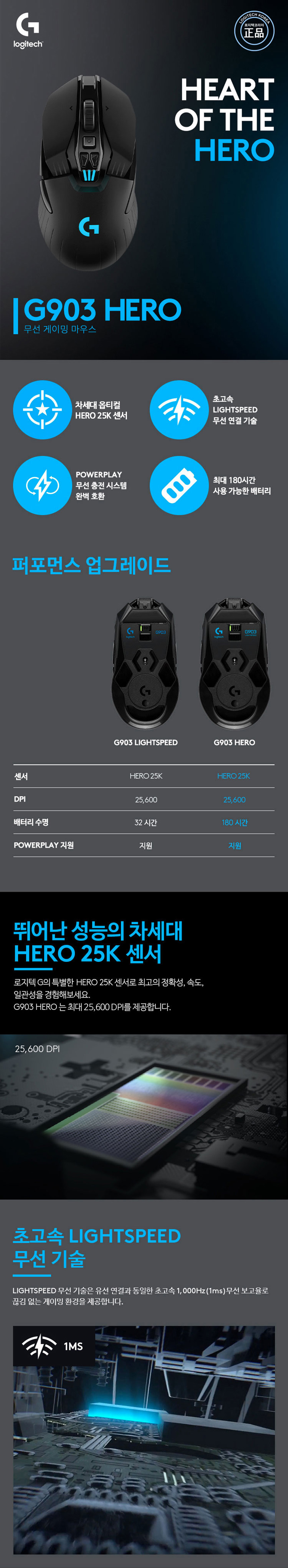 • 로지텍코리아정품 G903 HERO WIRELESS 게이밍 무선마우스