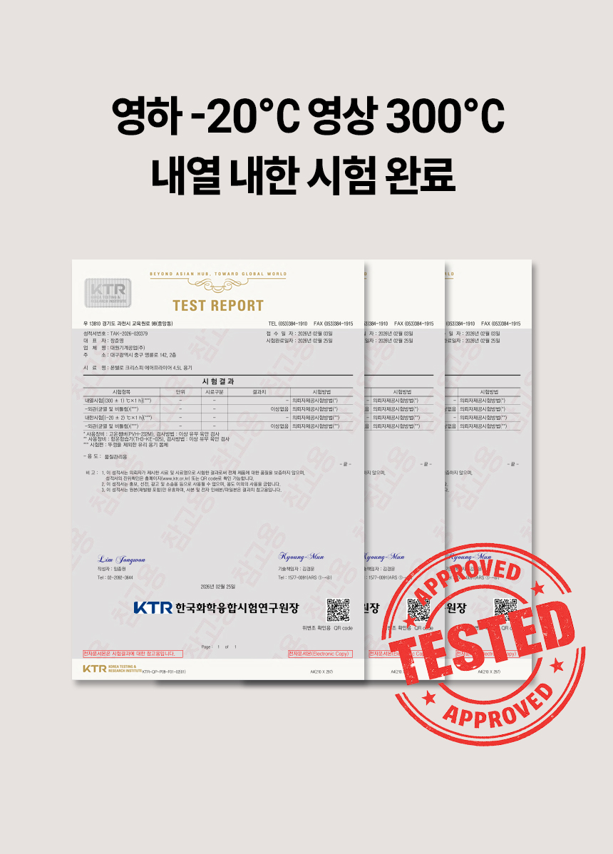 | KC 인증 필 유무 | 상품페이지 참고 (전기용품안전관리법 상 안전인증대상전기용품, 안전확인대상전기용품, 공급자적합성확인대상전기용품에 한함) |