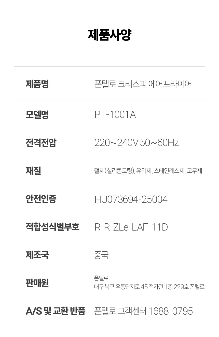 | A/S 책임자와 전화번호 | 상품페이지 참고 |