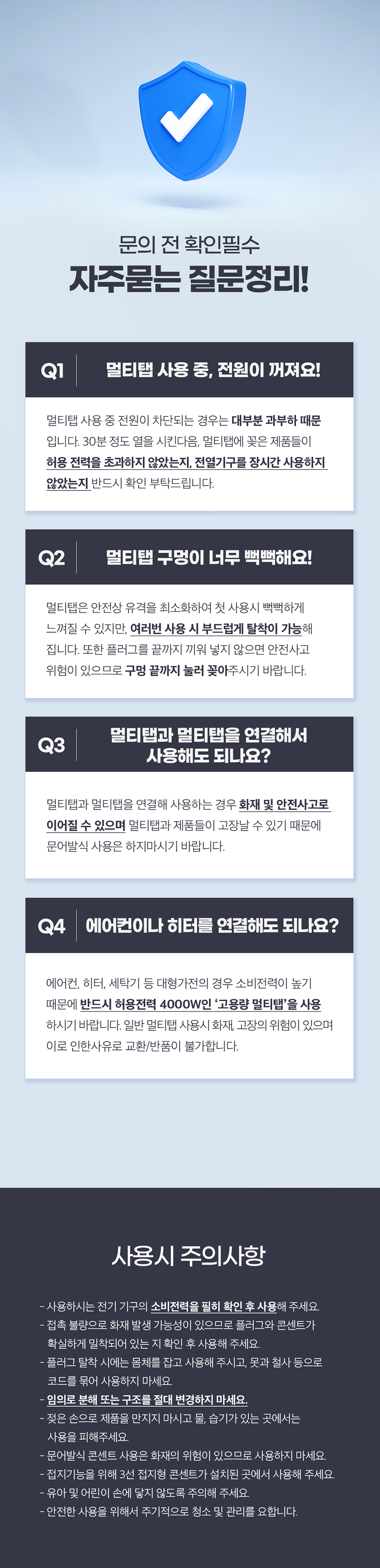 → 과부하 + 누전 감지 차단 필요 → 고용량 멀티탭 누전 차단