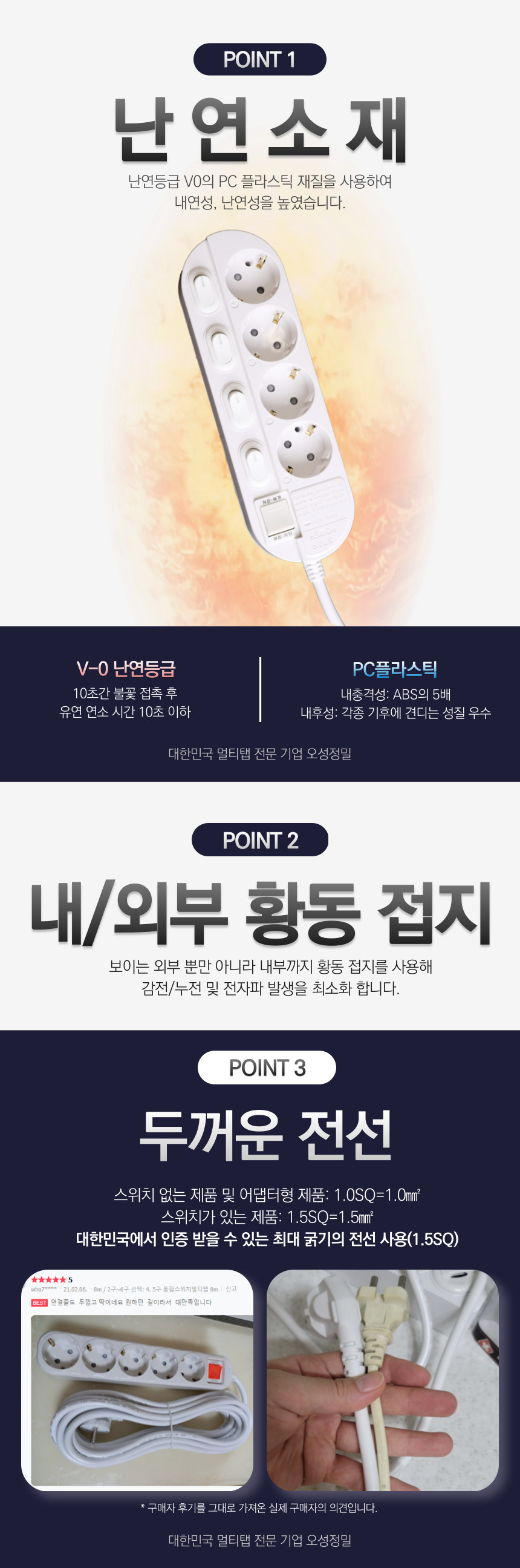 반면 오성정밀 멀티탭은 V-0 난연 등급과 PC 플라스틱 사용으로