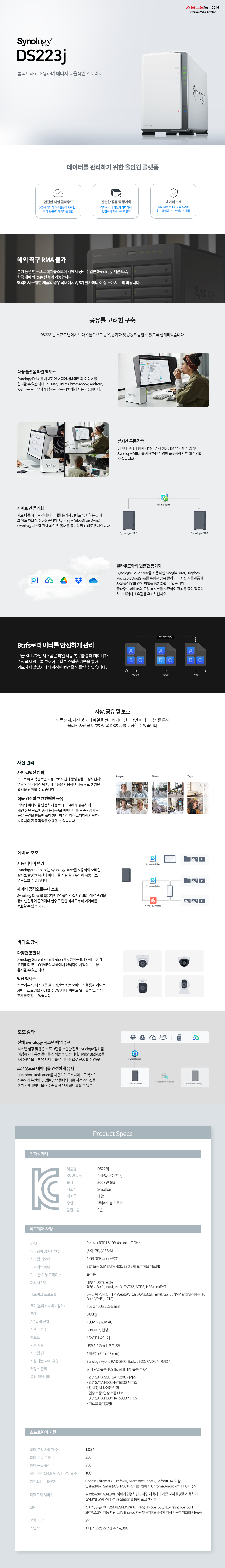 NAS / [사양] 리얼텍 RTD1619B (4코어, 1.7GHz) / DDR4 1GB / 1Gbps (기가비트) / 랜포트: 1개 / [저장소] 3.5베이: 2개 / 장착디스크: 8.9cm(3.5인치) , 6.4cm(2.5인치) / [RAID] RAID 0 / RAID 1 / JBOD / Basic / 외부포트: USB3.0 / 주변장치: 잠금장치 / [지원] 프로토콜: HTTP , HTTPS, FTP , SMB(CIFS) , AFP , NFS ,- 제조사
