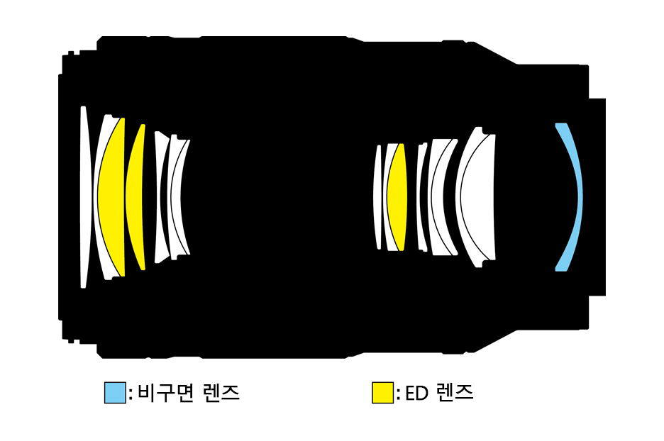 ED 렌즈(3매)를 효과적으로 배치한 광학계에 의해 근거리에서 무한대까지 축상색수차를 철저하게 보정합니다. 특히 가까운 거리에서 촬영 시 눈에 띄기 쉬운 초점면 전후의 색 번짐을 줄이고, 해상력이 높은 화상을 얻을 수 있습니다.