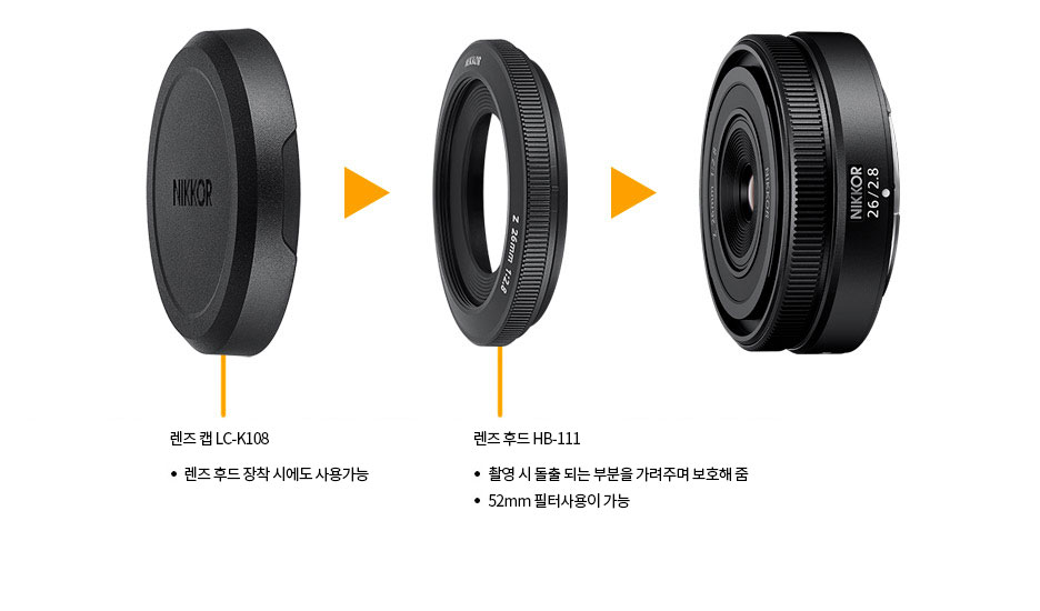 전용 후드는 경통과 일체감 있는 디자인으로 얇은 바디를 유지하면서 돌출된 부분을 보호하며 52mm 필터사용이 가능합니다. 전용 렌즈 캡은 렌즈 후드 장착 시에도 사용할 수 있습니다.