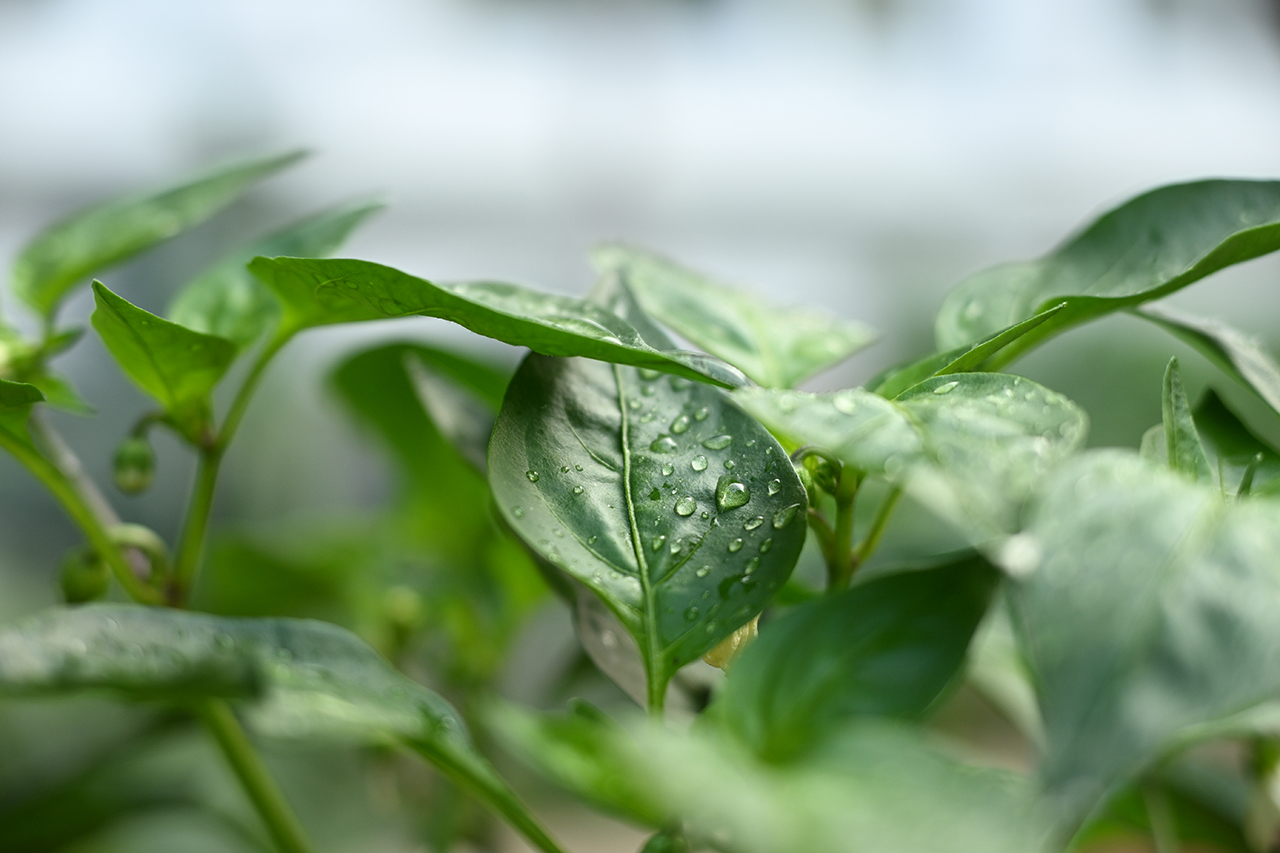 물방울을 머금은 잎에 초점을 맞추고 촬영했습니다. 조리개를 개방하여 피사체에 접근하여 촬영했기 때문에 피사계 심도가 얕아져 앞뒤의 피사체를 크게 흐리게 할 수 있었습니다. 초점이 맞는 부분과 앞 뒤의 보케의 대비가 더욱 두드러져 매끈한 잎의 느낌을 잘 살릴 수 있었습니다.
