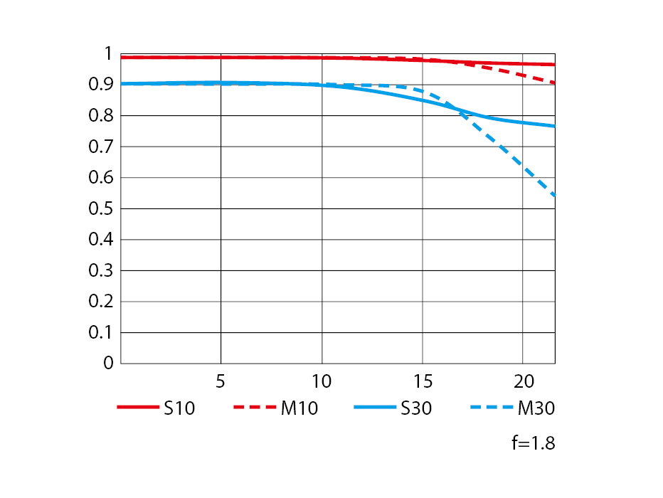 개방 F값 1.8에서도 화면 전 영역에서 풍부한 주변 광량을 확보합니다. 사진에서도 동영상에서도 화면 전체적으로 균일한 밝기와 보케를 얻을 수 있습니다.